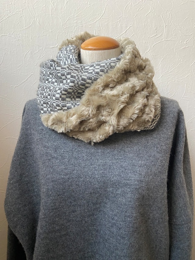 手織りの部分にはovershotという技法で Monksbeltと呼ばれる古典柄を 手織りで織り出しました 経糸にシルクウール、 緯糸にシルクウールとウールの糸を使っています その手織りの生地と2色のフェイクファーを繋ぎ スヌードにしました ボリュームがあり、さらに輪をねじってあるので 首に密着し暖かく、また脱着も楽に出来ます おうちで洗濯できますが、 中性洗剤で手洗いコースなど優しいコースを選び、 また熱に弱い繊維のため乾燥機のご使用はお控えください 袋状に縫製してあるためしっかりと乾かしてからご使用ください 重さ : 約 160g 生地の縦幅 : 23cm 横に広げた時の輪の幅 約 30cm ご利用のモニター環境によって 画像の色味がわずかに異なって見える場合がありますので ご了承ください。 複数枚をご購入の際は、同梱&送料1回分で送らせていただきます。 ・PayID(BASE)アプリでご覧の方は画像をクリックすると 全体画像が見られます。