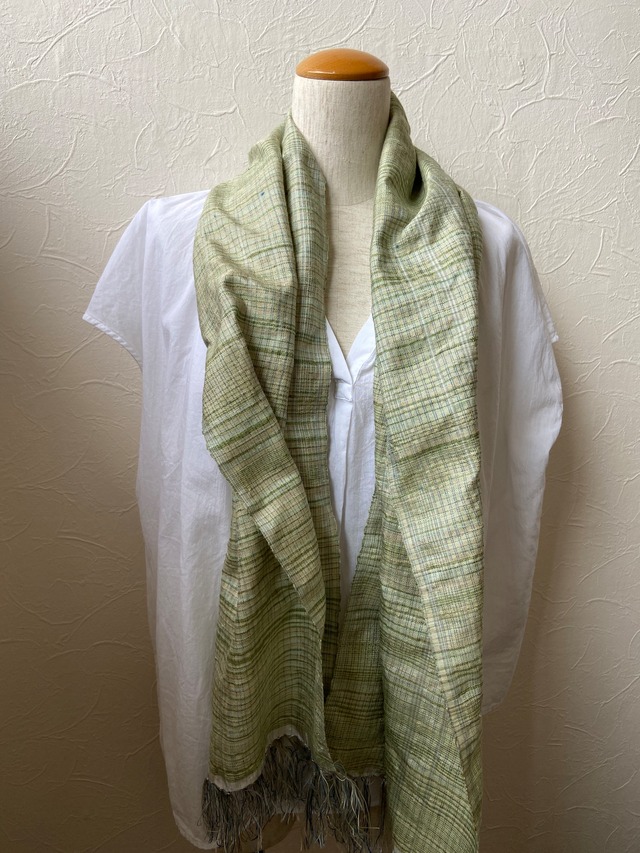 紬の着物に使用する絹糸を草木で染め、 手織りしたストールです。 着物よりも密度を少なくし、緩く織っているので、 糸と糸の間に隙間が入り、 とても柔らかく軽い仕上がりになっています。 陽にかざすと光が透けるほどです。 染料に使用した植物は 藍 クサギ 葛 サイズ 31cm × 158cm 房 7cm 重さ 44g 緩く織る分、引っ掛けたりすると 糸目がズレることがあります。 小さなズレは針などを使って直せますが、 大きく引っ掛けないようご注意ください。 洗濯は手洗いで押し洗い、もしくはネットに入れて 手洗いコースのご使用をおすすめします。 ご利用のモニター環境によって画像の色味がわずかに 異なって見える場合がありますのでご了承ください。 ・PayID(BASE)アプリでご覧の方は画像をクリックすると 全体画像が見られます。
