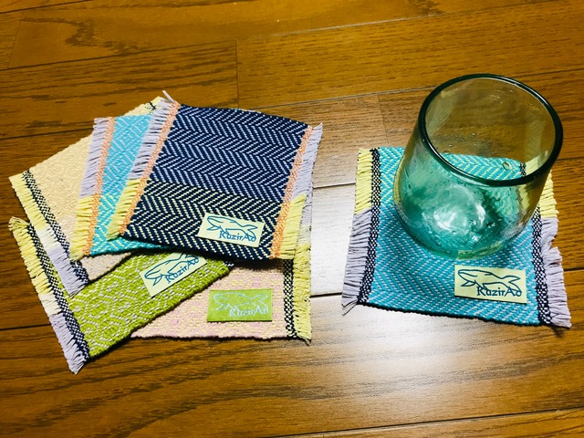 手織りした生地を表に、綿麻生地を裏地に仕立てたコースター2枚セットです。 組織織という技法で、色々な模様を織り出しました。 裏面に画像にあるどちらかのロゴタグが付いています。 表:木綿 裏:綿麻 サイズ 縦横ともに10~11cm 重さ 8~9g 複数枚をご購入の際は、同梱&送料1回分で送らせていただきます。