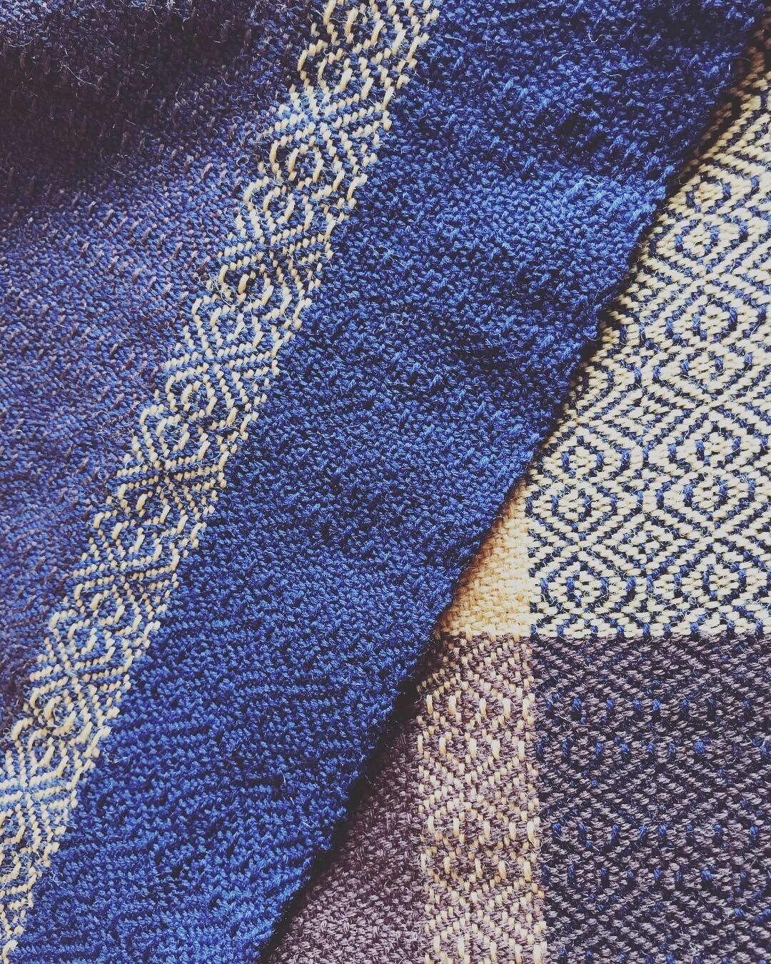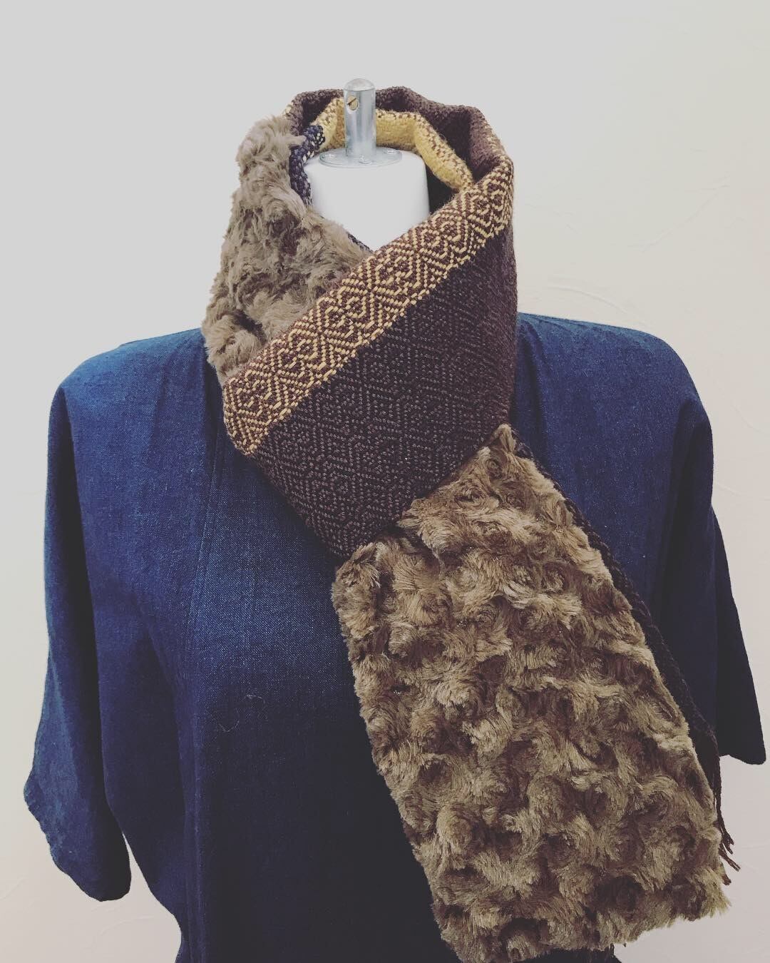 模様を織り出したウールとトルネードファーを繋いだマフラーです。