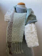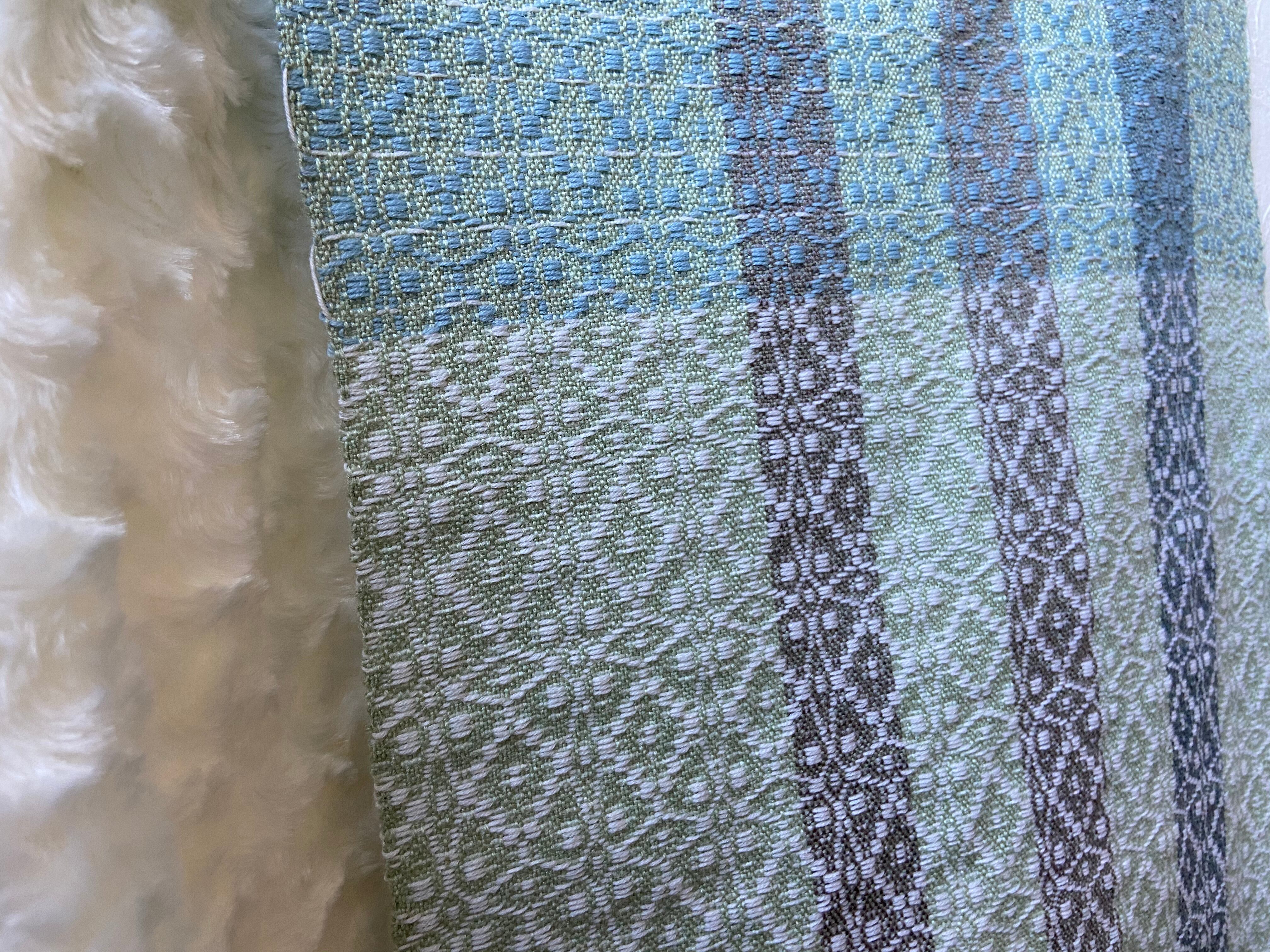 overshotという技法で手織りで模様を織り上げた
