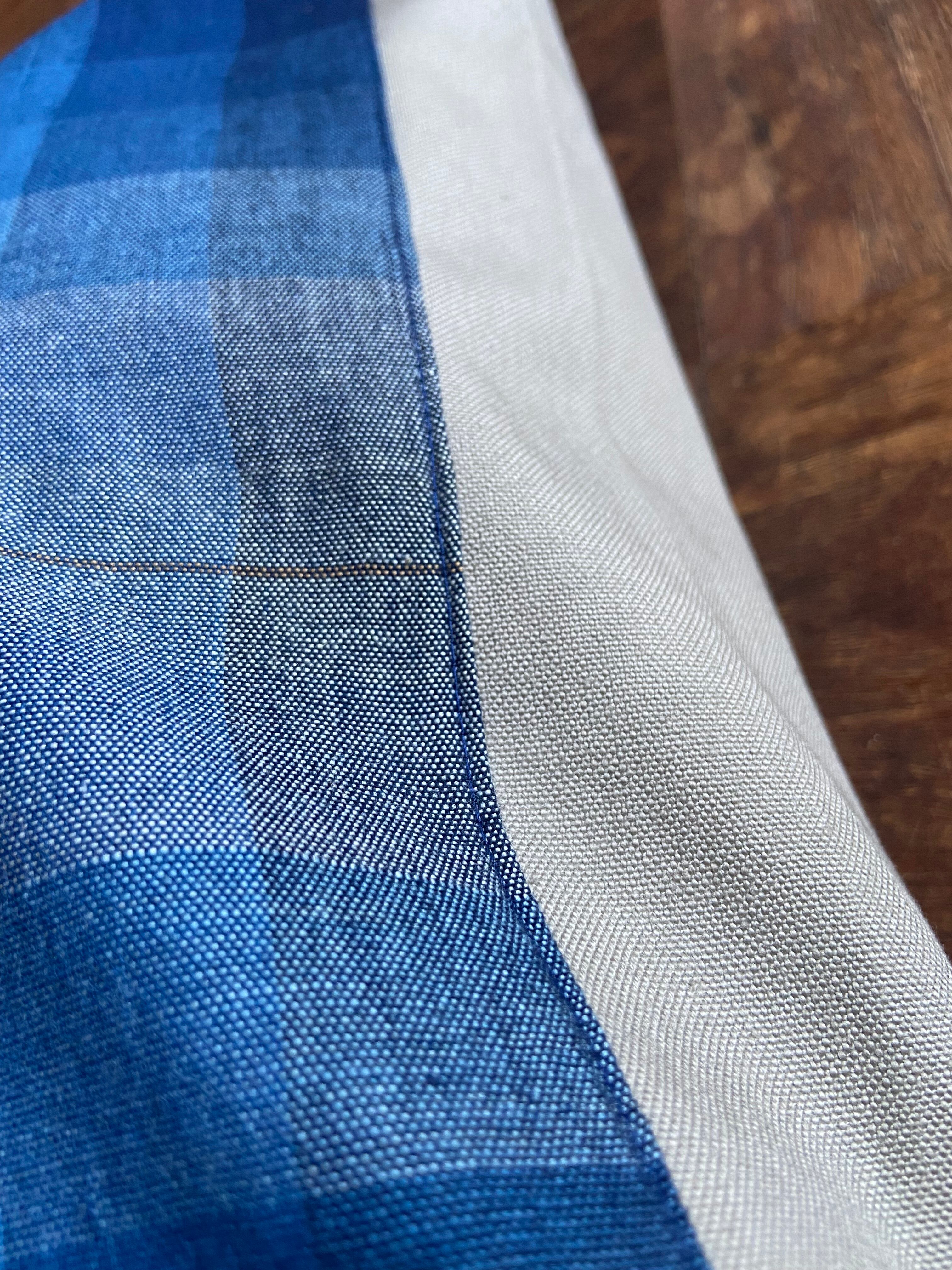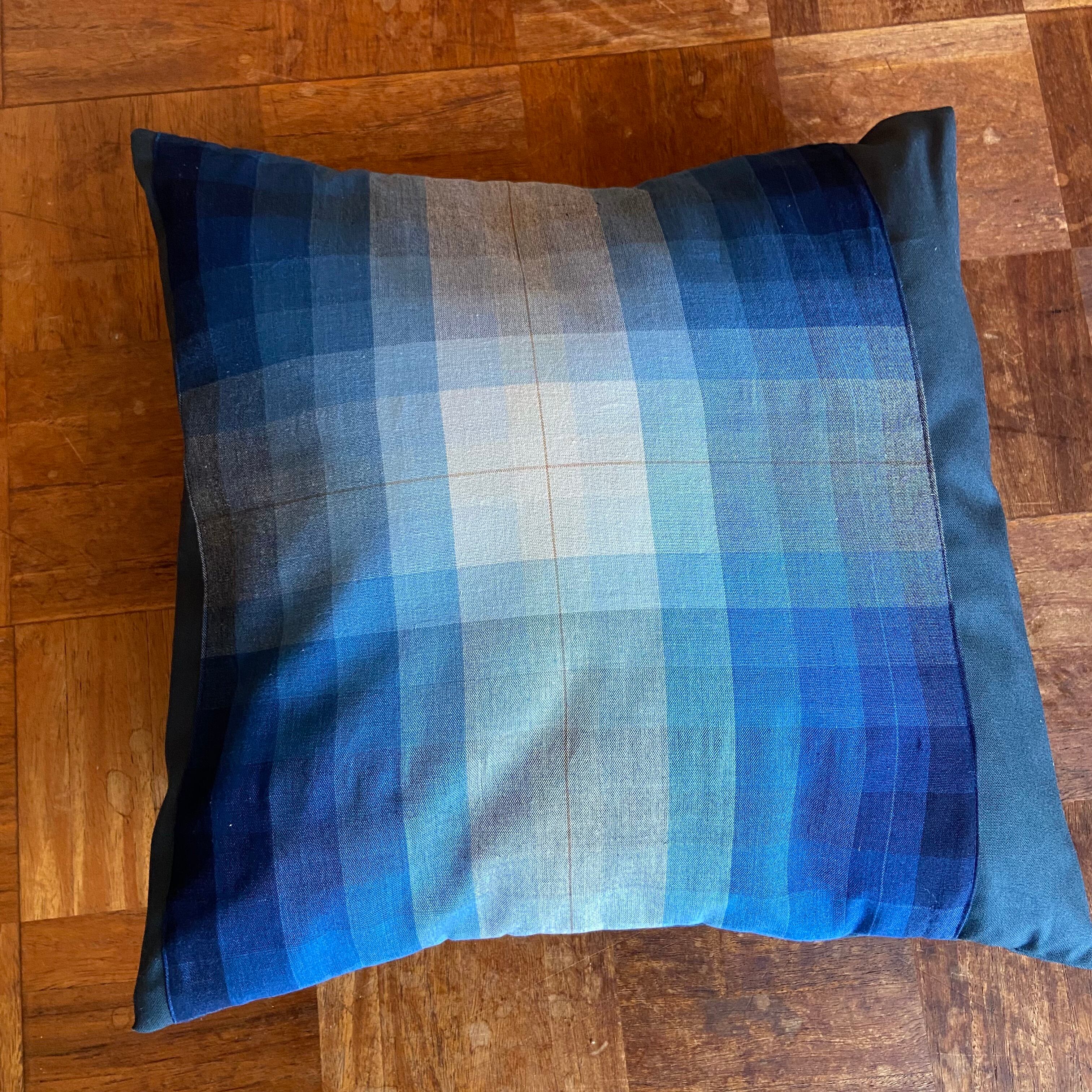 11号帆布生地に藍と草木染の糸で手織りした生地を縫い付けています。