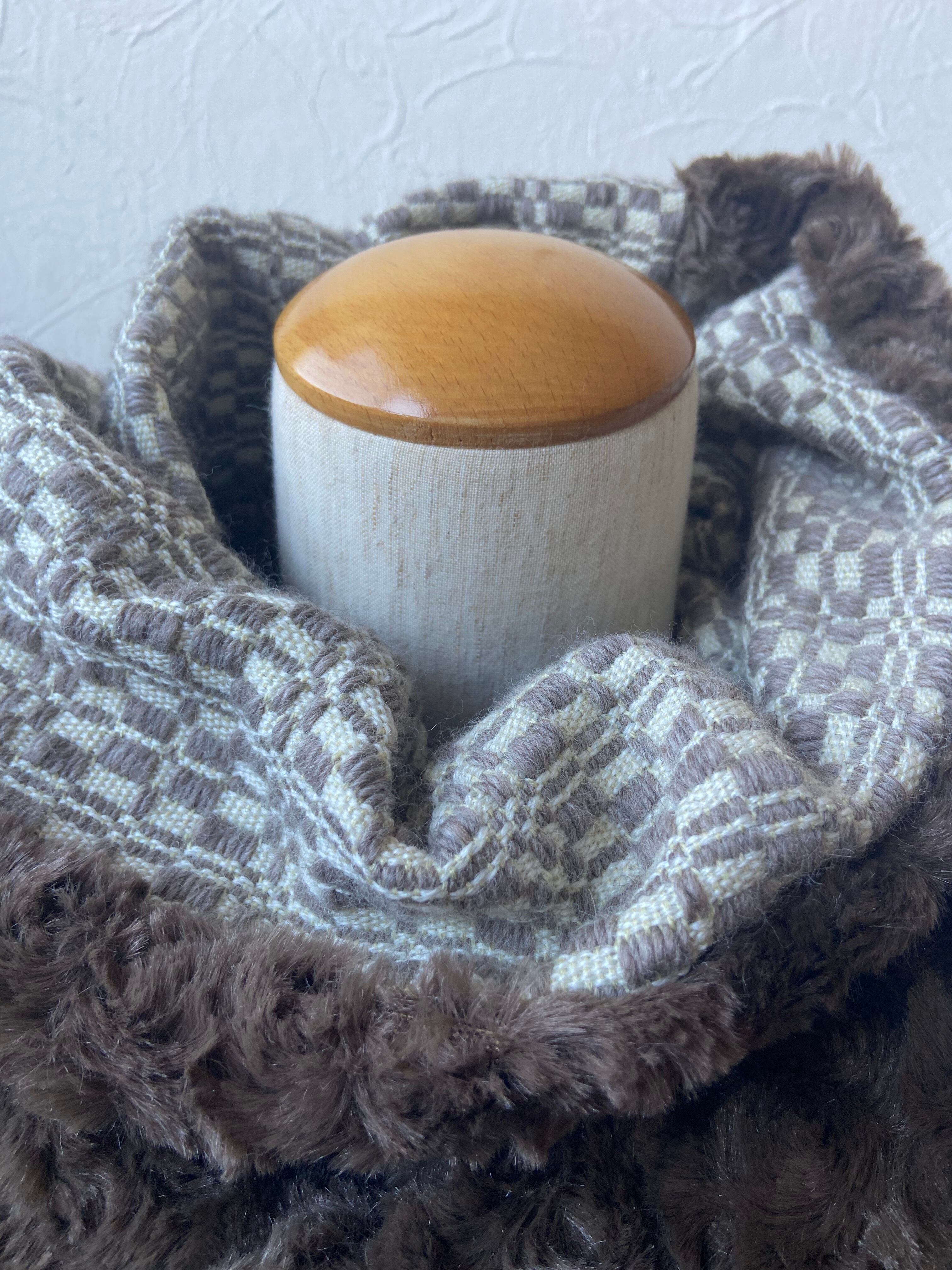 その手織りの生地とフェイクファーを繋ぎ